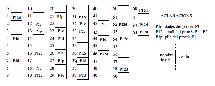 Segment Mida Procés 1 Procés 2 Codi (A) 100 bytes X X Codi (B) 120 bytes X Dades (D) 14 bytes X X Dades (E) 90 bytes X Les X’s en la taula indiquen quins procediments i dades estan assignats a cada procés. Una fila amb dos o més X’s indica que el segment està compartit. A més, cada procés està format per un segment d’stack de 64 Bytes.