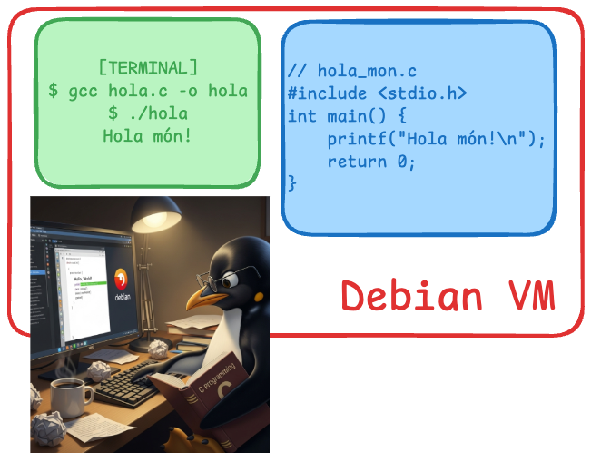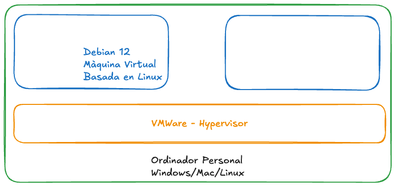 Una màquina virtual amb Debian 12 comparint recursos amb el vostre ordinador físic.