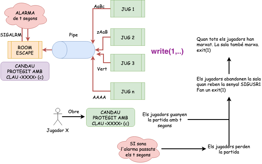 Els jugadors acertaran la clau enviant-la al procés pare mitjançant un pipe i guanyaran si ho aconsegueixen abans que s’acabi el temps.