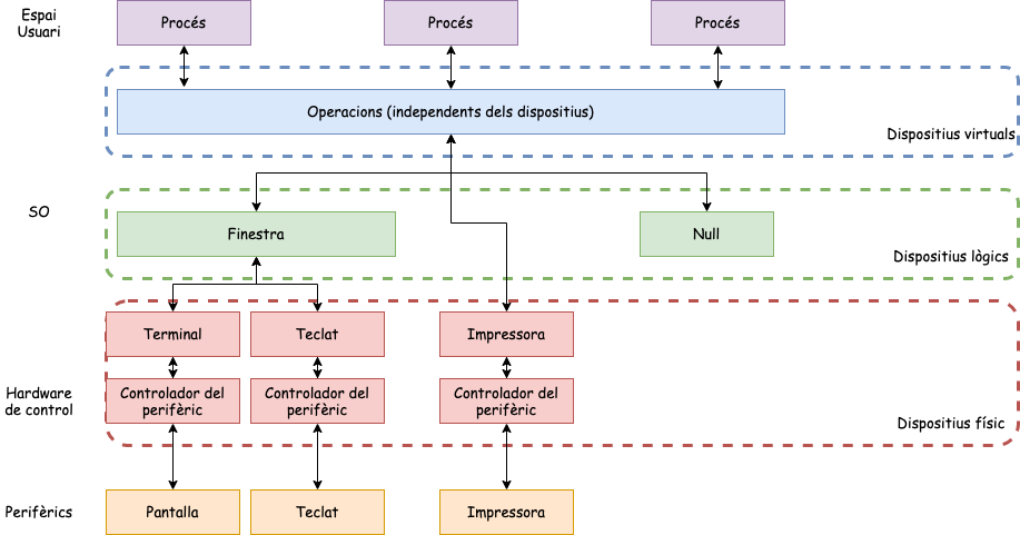 Uns dels objectius del SO és proporcionar una màquina virtual que uniformitzi la complexitat dels dispositius d’E/S, necessitem independitzar les operacions i els dispositius.