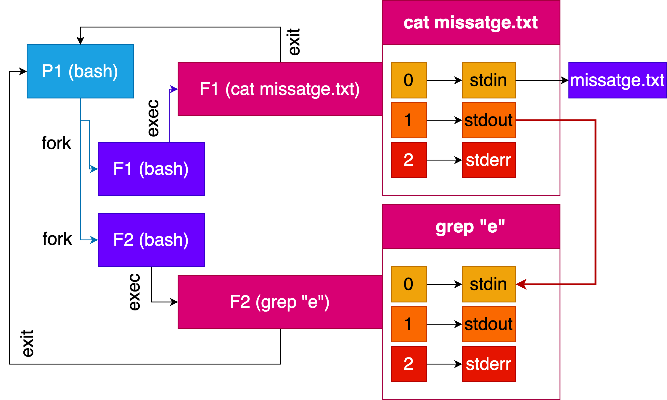 En bash, podem utilitzar pipes per a comunicar dos processos. Per exemple, podem utilitzar el comandament echo per a enviar un missatge a través d’un pipe i el comandament cat per a llegir aquest missatge.