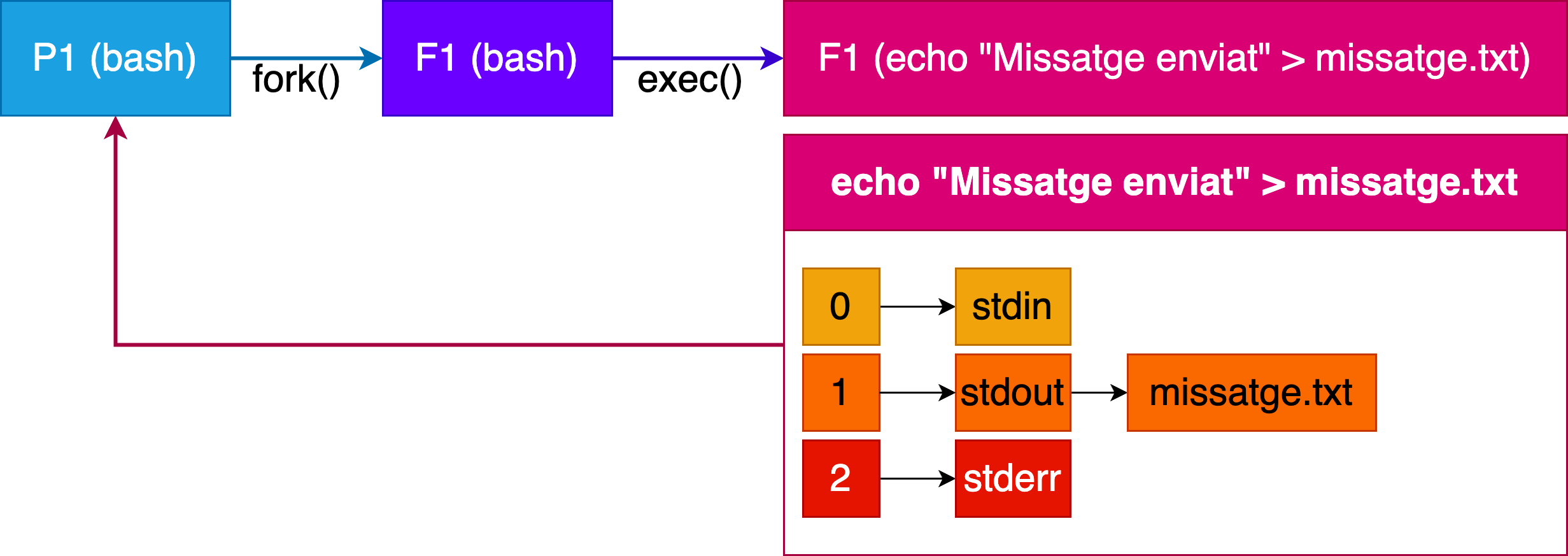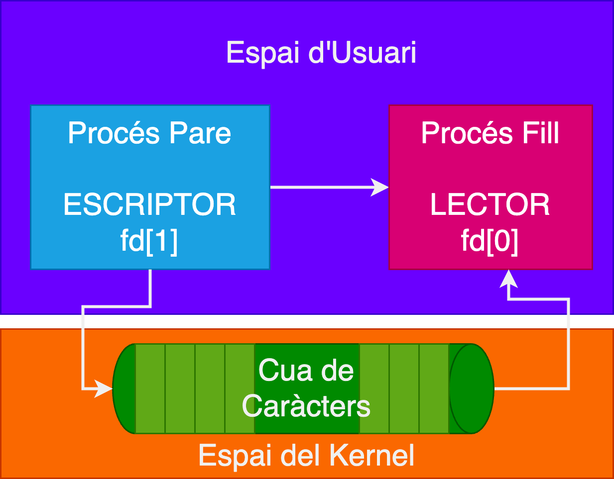 Un procés 2 (lector) llegeix el missatge d’aquest fitxer i el mostra per pantalla.