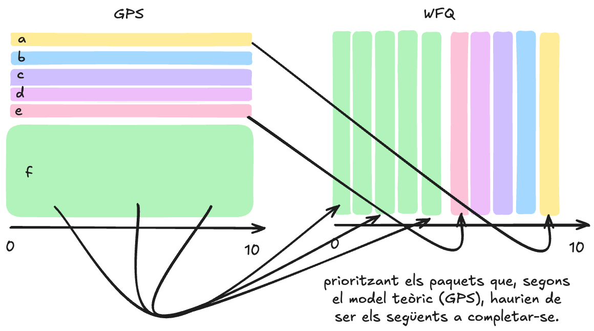 Weighted Fair Queuing (WFQ) és un algorisme real i implementable que aproxima el comportament ideal del GPS. A les xarxes, els recursos es transmeten com a paquets discrets (no com a fluids). Per la qual cosa, l’enllaç només pot transmetre un paquet complet a la vegada (no simultàniament).