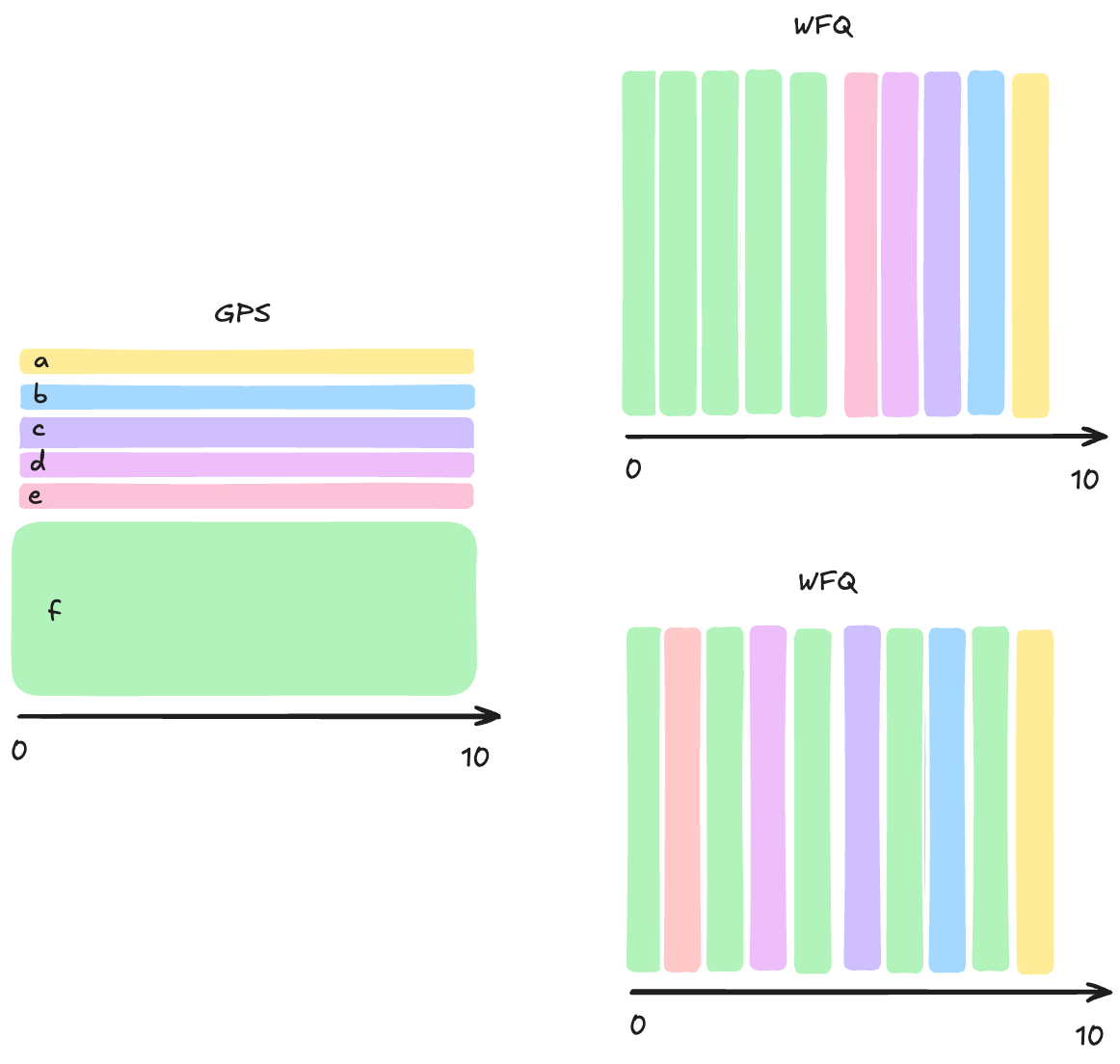 No Apropiatiu: Si un paquet de prioritat alta arriba mentre se’n transmet un altre de baixa prioritat, el segon no pot ser expulsat immediatament. Per mantenir la justícia, el WFQ necessita una mètrica estable i independent de la mida dels paquets que representi el servei ideal rebut (Temps de Finalització Virtual).