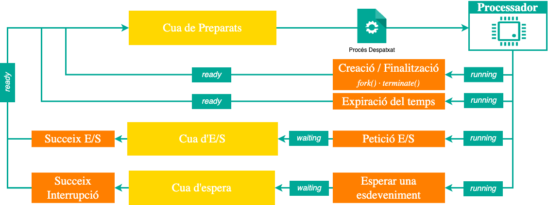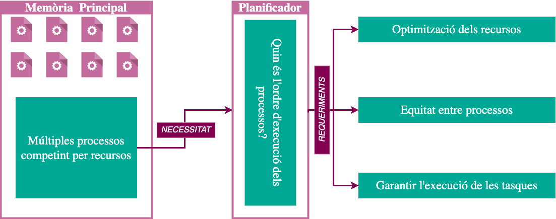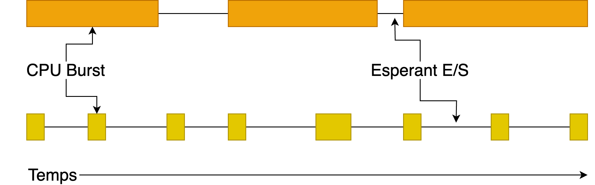 Els processos presenten necessitats variades a l’hora d’utilitzar els recursos del sistema. En general, la majoria dels processos passen per cicles de burst, alternant entre períodes d’activitat intensiva d’ús del processador (CPU) i períodes d’activitat d’entrada/sortida (E/S).