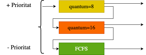Moviment Dinàmic entre Cues: Si un procés no finalitza dins del seu quantum assignat, es mou a una cua amb menor prioritat, on rebrà un quantum més llarg però menor prioritat d’execució.
