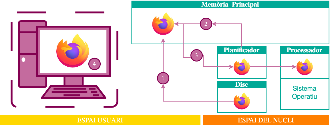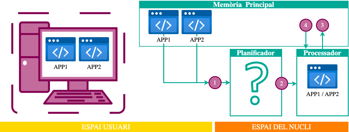El SO (1) Carrega a Memòria Principal. (2) El planificador selecciona el procés. (3) Despatxa a la CPU. (4) L’usuari interactua amb l’aplicació.