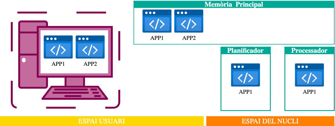 Què passa en aquest escenari si el sistema operatiu és monoprogramat? I si és multiprogramat? Pensa en com es gestionarien APP1 i APP2 en cada cas.