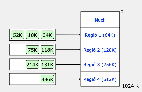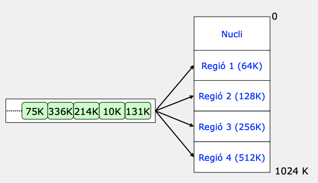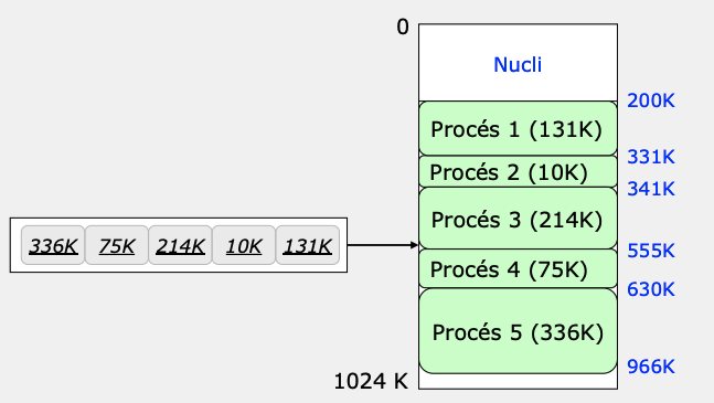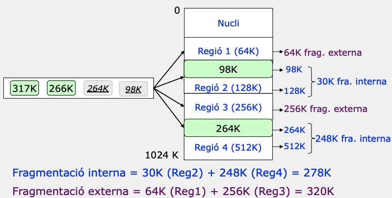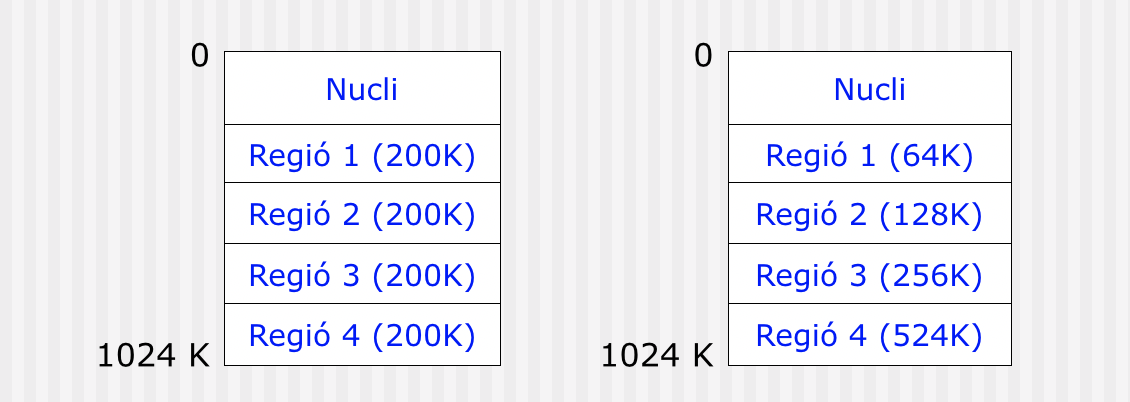 Per exemple, si tenim una partició de 100KB i un procés de 50KB, la partició de mida fixa tindrà 50KB de fragmentació interna, mentre que la partició de mida variable tindrà 0KB de fragmentació interna.