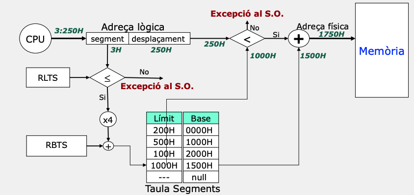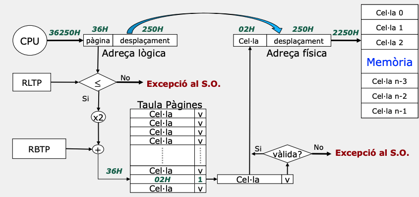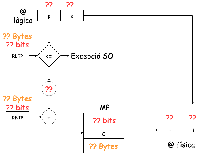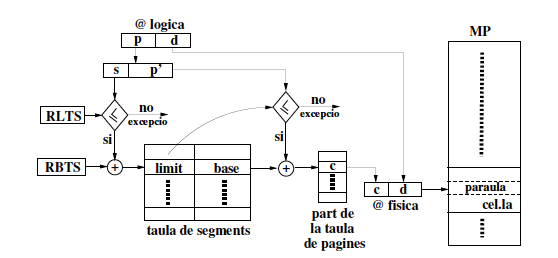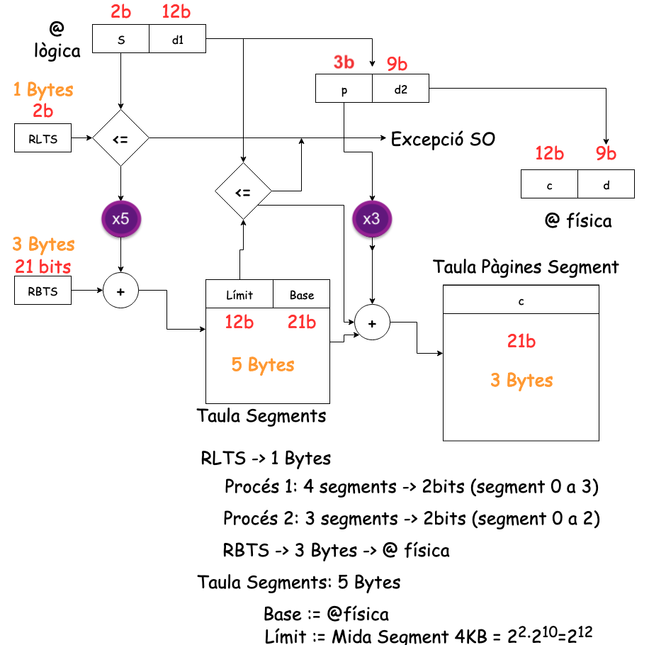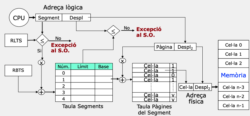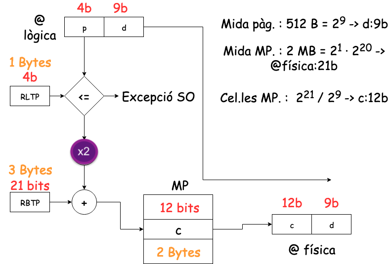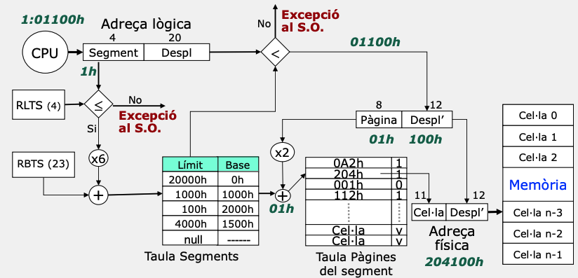 Adreça lògica: Segment (4 bits) + Pàgina (8 bits) + Desplaçament 2 (12 bits).