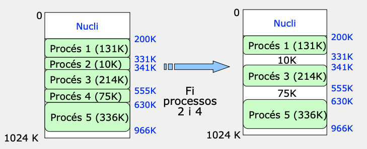Externa. Es produeix quan existeix espai de Memòria lliure per satisfer els requeriments, però no és contigua i per tant no el podem utilitzar. Imagineu que tenim dues àrees de memòria lliure de 300 bytes cada una, però estan separades per una àrea ocupada de 200 bytes, no podem satisfer una sol·licitud de 500 bytes, tot i que hi ha prou memòria lliure en total.