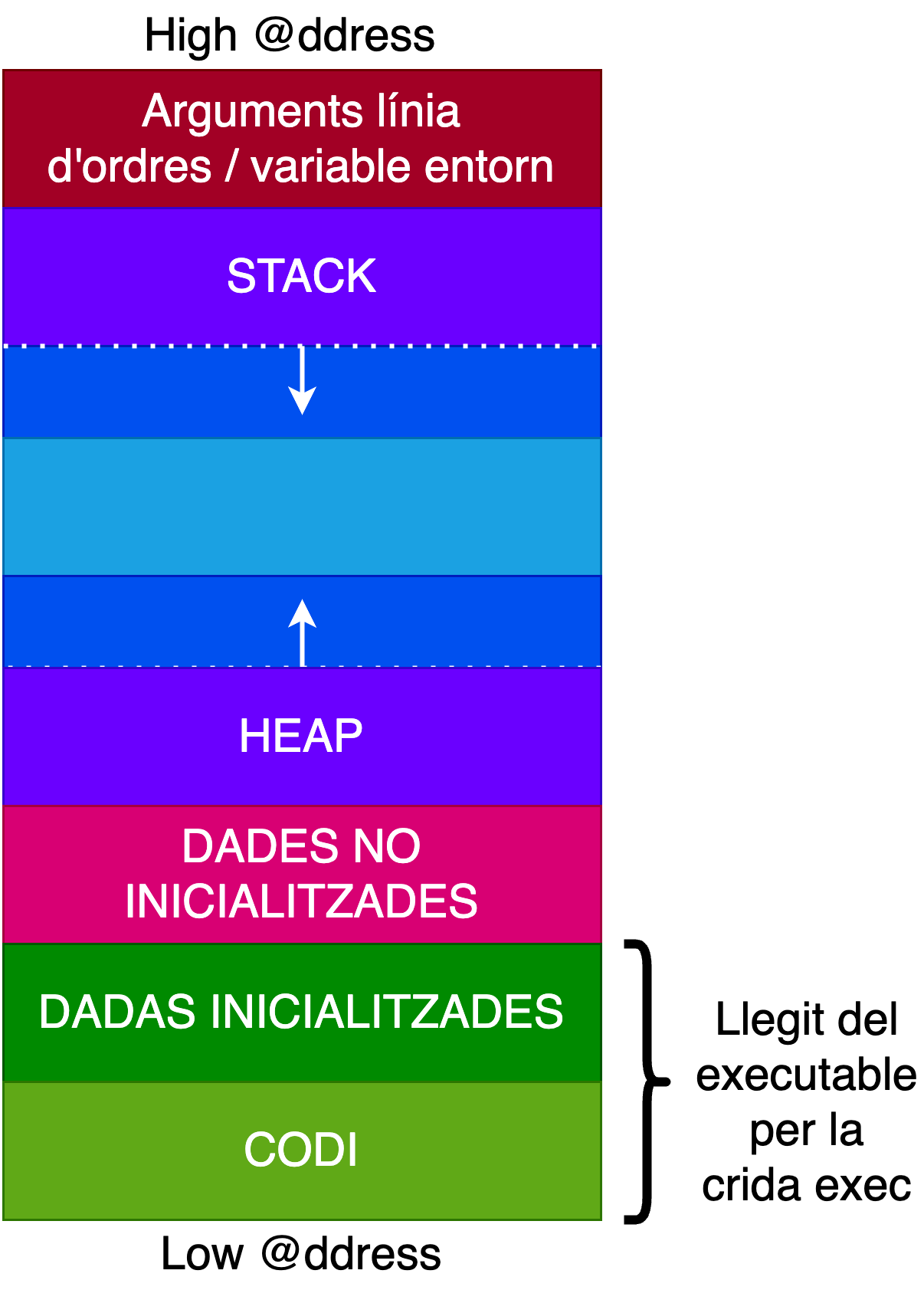 }Espai lògic d’un procés (Relatives): Adreces de la memòria que contenen el codi, les dades (inicialitzades i no inicialitzades) i la pila del procés. Aquest espai es crea en el moment d’execució del programa. Per exemple, una variable pot ser referenciada com a 10 bytes des de l’inici de les dades.
