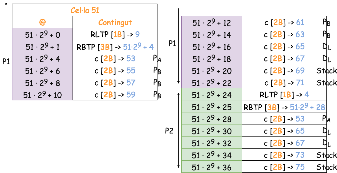 Disposem d’un sistema de gestió de memòria on la mida de la pàgina és de 512 bytes, la de Memòria és de 2 MB, i la d’una paraula 1 byte. Un procés consta de com a molt 4 segments. La mida màxima d’un segment és 4K. Totes les taules s’implementen en memòria principal. Donats els dos processos següents: