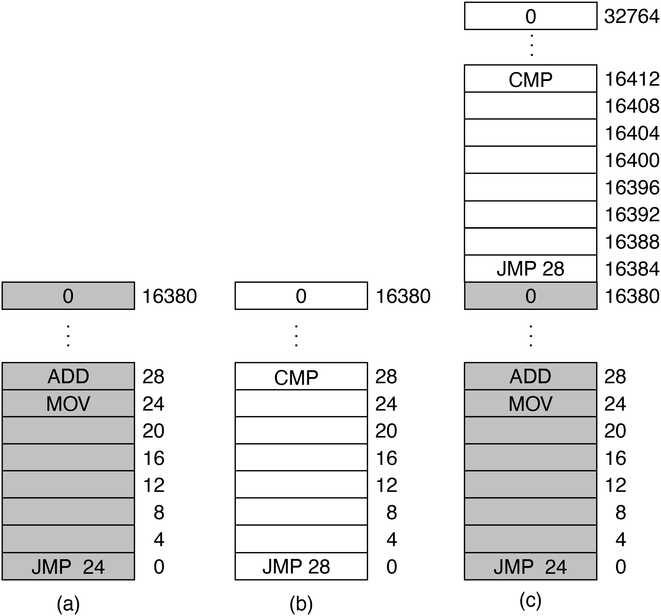El programa A espera que la instrucció MOV estigui a la posició 24 de la memòria, i el programa B espera que la instrucció CMP estigui a la posició 28 de la memòria. Si no tenim un mecanisme de reubicació de la memòria, les seves expectatives es veuran compromeses. Fixeu-vos que cada programa té la seva zona de 16KB però es poden solapar. Necesitem un mecanisme que ens permeti reubicar la memòria.